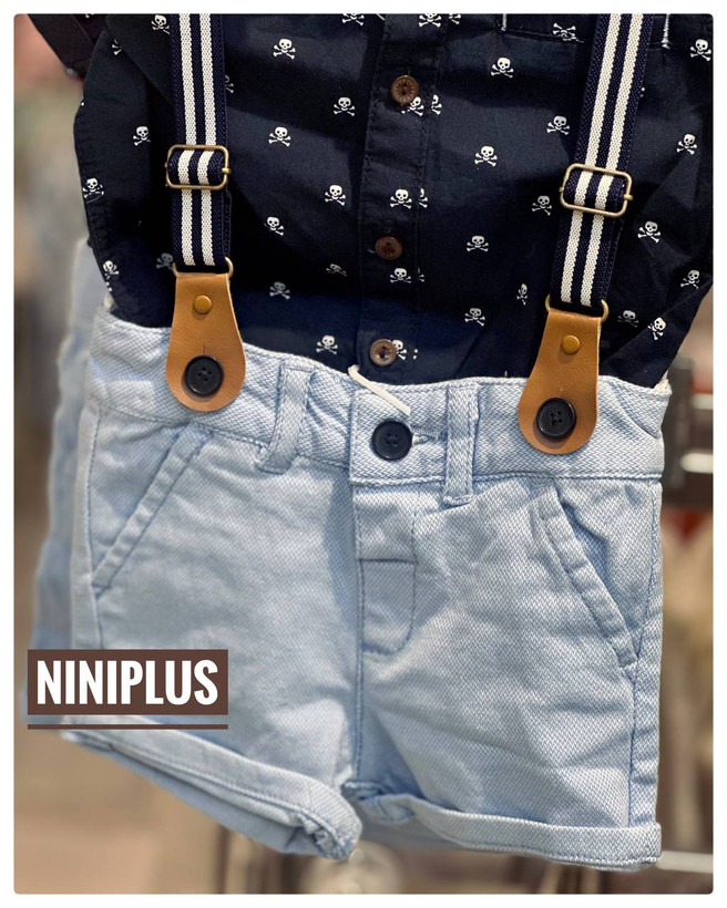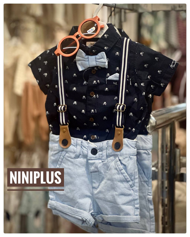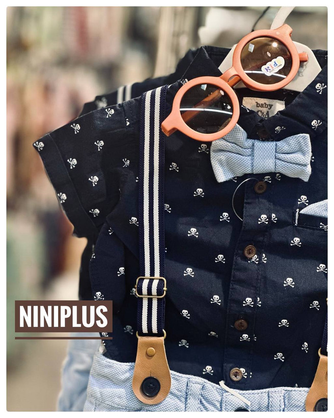 لباسهای ناز و رسمی برند C&A با طراحی منحصربهفرد و راحت برای مهمانیها و روزهای خاص! این ست شامل پیراهن کوتاه آستین با طرح جمجمههای بامزه، شورتک جین آبی روشن، سوسپاندر شیک و پاپیون ببتی است. عینک آفتابی نارنجی هم جداگانه موجود و قابل سفارش است ، استایل کودک شما را تکمیل میکند! 😍