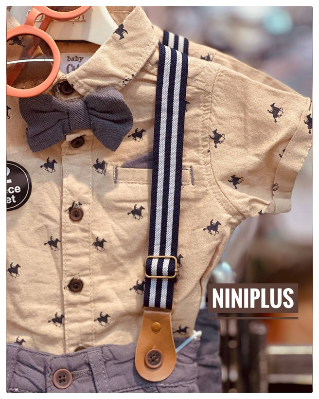 لباسهای ناز و رسمی برند C&A با طراحی منحصربهفرد و راحت برای مهمانیها و روزهای خاص! این ست شامل پیراهن کوتاه آستین با طرح اسبهای بامزه، شورتک جین آبی روشن، سوسپاندر شیک و پاپیون ببتی است. عینک آفتابی نارنجی هم جداگانه موجود و قابل سفارش است ، استایل کودک شما را تکمیل میکند! 😍