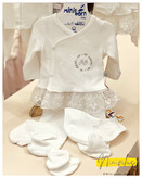ست شامل مانتو، شلوار جورابدار، پیشبند، دستکش و کلاه بوده و برای نوزادان ۰ تا ۳ م